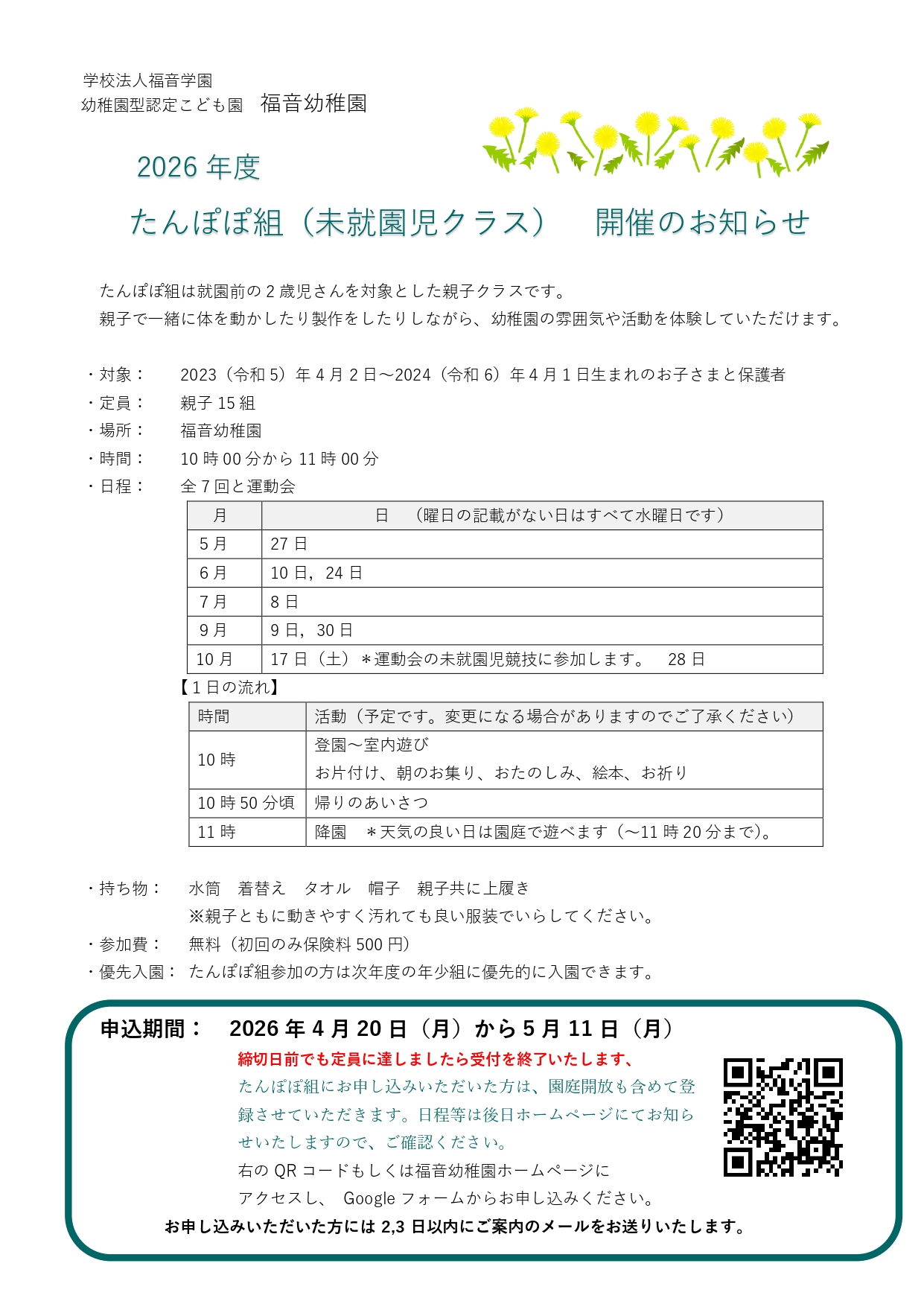 たんぽぽ組(未就園児クラス)のご案内 実施日等詳細は下記のチラシをご覧ください。 対象: 2023(令和5)年4月2日から2024(令和6)年4月1日生まれのお子様と保護者の方 定員: 親子15組 申込期間: 2026年4月20日(月)から5月11日(月)まで ※定員に達しましたら受付を終了いたします。 こちらのgoogleフォームからお申込みください。 |